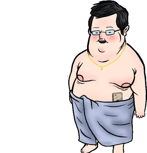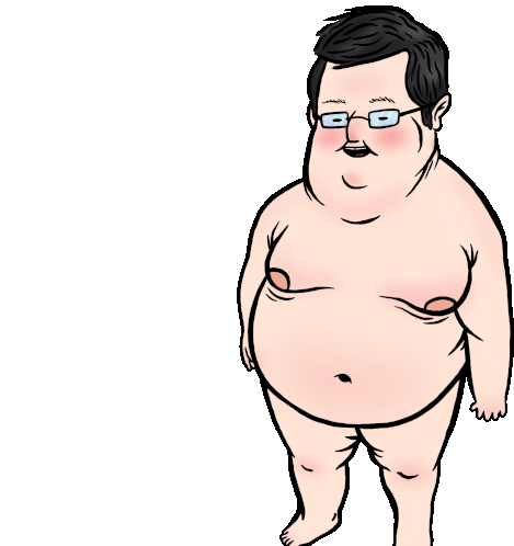 Pipo Pipote, a cartoon man with glasses and a mustache, stands naked as the text 'MAN DA NUDES' appears and changes color.