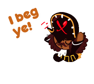 Pirate Cookie from Cookie Run on its knees, crying and desperately begging with the caption 'I beg ye!'