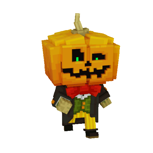 a pixel art character with a pumpkin head and a bow tie