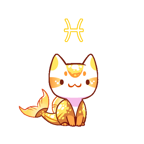 An adorable animated sticker featuring a cute cat with a fish tail, representing the Pisces zodiac sign, sparkling with golden magic.