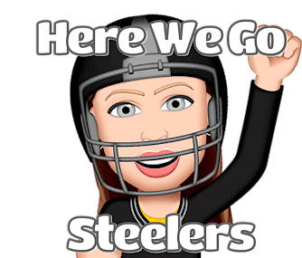 An excited Pittsburgh Steelers fan in a football helmet cheers, exclaiming "Here We Go Steelers!" showing team spirit.
