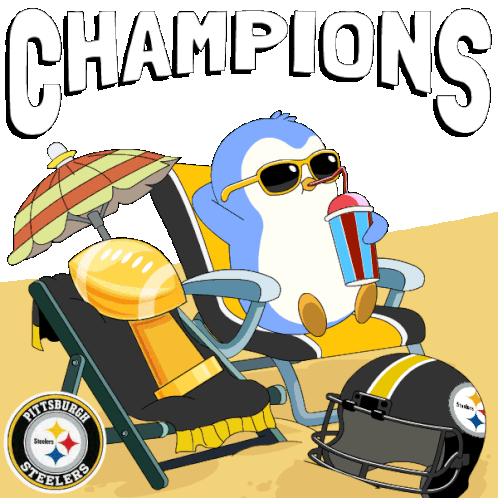 a pittsburgh steelers penguin sits in a beach chair