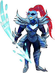 Undyne the Undying from Undertale in her pixel art armored form, holding a glowing spear in an idle pose.