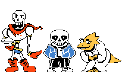 Animated pixel art sticker featuring Undertale characters Papyrus, Sans, and Alphys in their iconic idle poses.