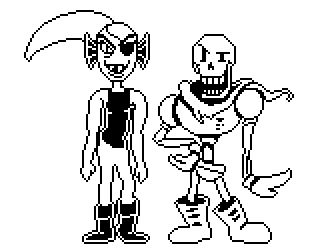 a black and white pixel art drawing of a skeleton and a fairy .