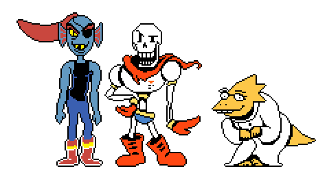 a pixel art drawing of undertale characters including papyrus and alphys standing next to each other .