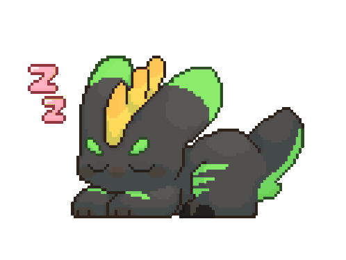 A cute pixel art Putao, a black mythical Qilin beast with green accents and a yellow tuft, is peacefully sleeping with Zzz above its head.