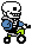 Sans from Undertale joyfully rides a green pixel art tricycle. A fun animated sticker for fans of the game.
