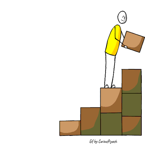 Piyueshmodi's Curiouspiyuesh character climbs a stack of blocks, representing steady progress and growth through effort.