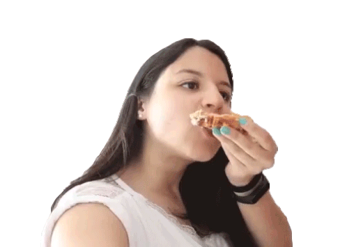 Natalia enthusiastically eats a slice of delicious pizza, expressing pure enjoyment with a 'ñam' sound.