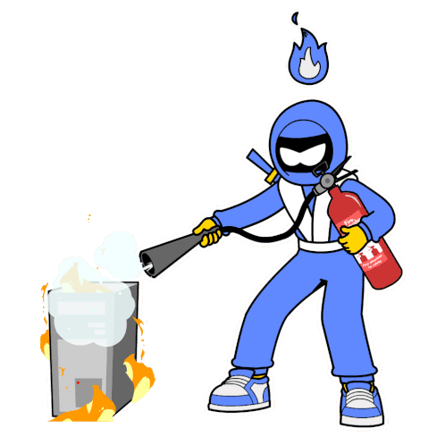 Pizza Ninjas Pizza Pets character extinguishes a server on fire with a fire extinguisher.