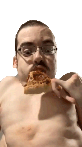 Ricky Berwick, shirtless and wearing glasses, enthusiastically eats a slice of pizza, making 'Nom Nom' sounds.