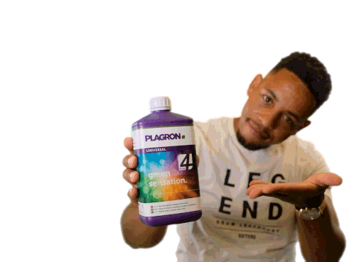A man in a 'LEGEND' t-shirt proudly displays a purple bottle of Plagron Universal Green Sensation, a plant nutrient.