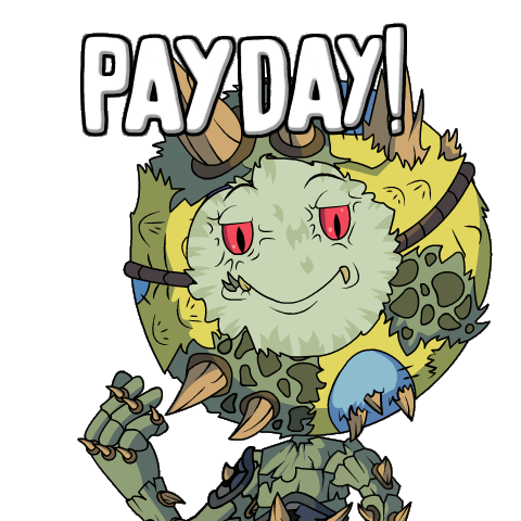 An excited Planet Xolo Villager celebrates payday with a happy expression, receiving a reward or salary.