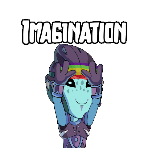 A cute Planet Xolo Villager alien character with a rainbow over its head, symbolizing imagination and creative thinking.