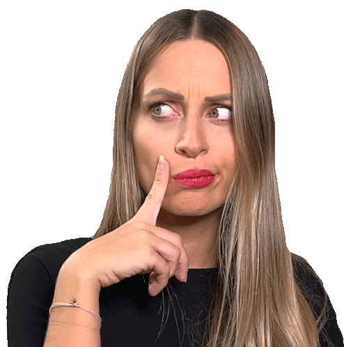 Planetradio Leni looks skeptical and thoughtful, touching her chin with a critical expression and rolling her eyes slightly.