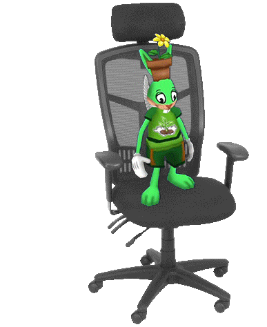 Plantasia, a character from Toontown Corporate Clash, spins playfully in an office chair, showcasing a fun, animated moment.