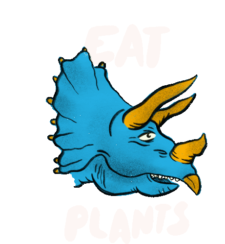A vibrant blue triceratops head with yellow horns chews happily, promoting a plant-based diet with the text 'Eat Plants'.