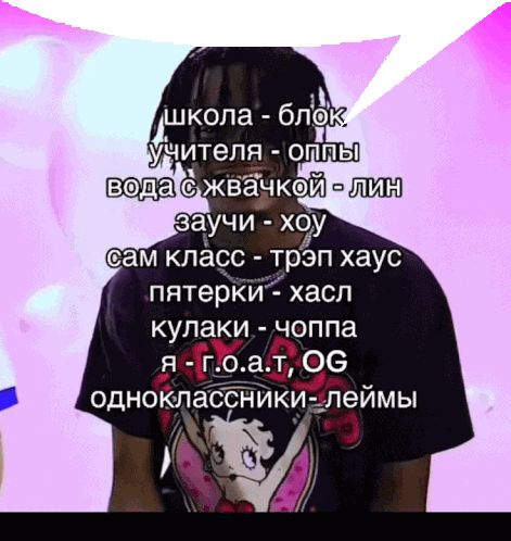 a man wearing a betty boop t-shirt has a speech bubble above him