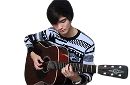 Tim Henson, wearing a beanie, skillfully plays an acoustic guitar, deeply focused on his music and strumming the strings.