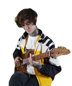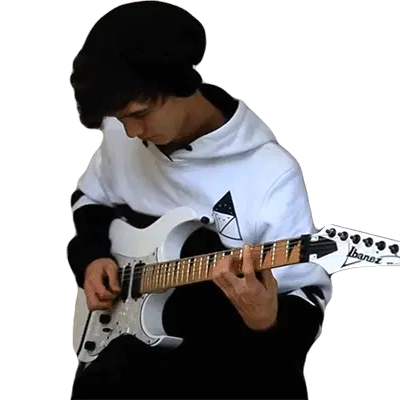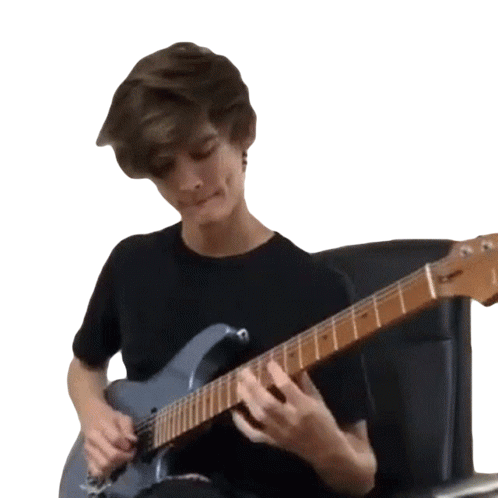 Tim Henson, the renowned guitarist, is seen intensely playing a blue electric guitar, showcasing his musical talent.