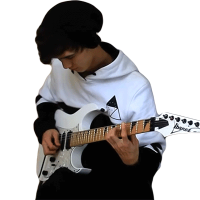 Tim Henson intently plays a white Ibanez electric guitar, showcasing his skill and passion for music.