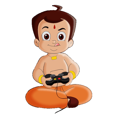Chhota Bheem, the popular cartoon character, sits cross-legged, engrossed in playing video games with a controller.