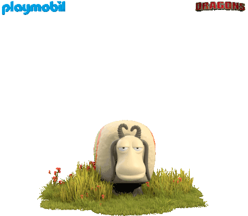 A sleepy Playmobil Dragons sheep stands in grass, looking bored and drowsy, ready for a nap.