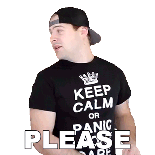 Jared Dines, wearing a 'Keep Calm or Panic' shirt, makes a pleading gesture with the word 'PLEASE' displayed.