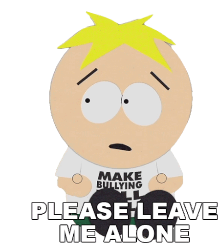 Butters Stotch from South Park looks upset, asking to be left alone. His shirt promotes "MAKE BULLYING".