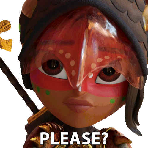 Maya from Maya and the Three makes a pleading expression, asking 'PLEASE?' with wide eyes and a hopeful smile.