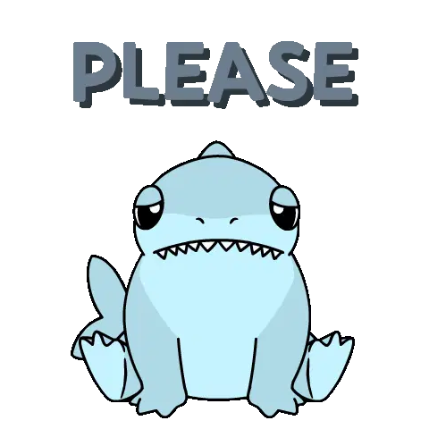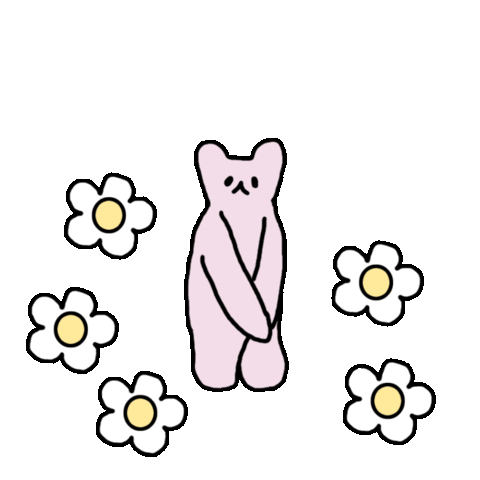 A cute pink teddy bear kneels with hands together, surrounded by flowers, with the word 'please' appearing, conveying a plea.