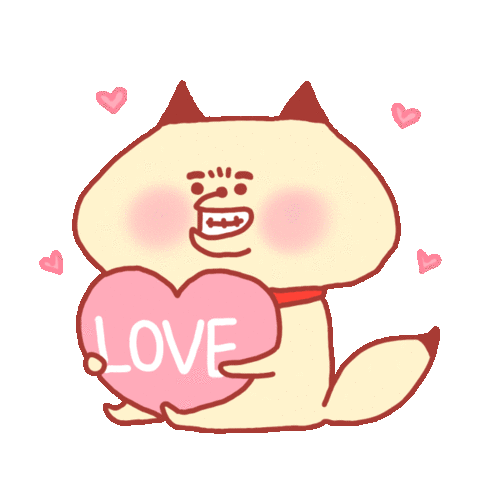 An adorable cat-like character with rosy cheeks holds a pink heart with "LOVE" written on it, surrounded by small hearts.