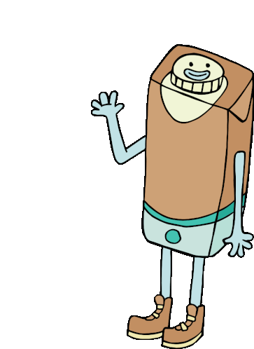 A friendly Plenny Drink Chocolate carton character with arms, legs, and shoes waves hello with a cheerful smile.
