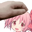 A playful animated sticker featuring a hand placing a delicious donut on Madoka Kaname's pink anime head.