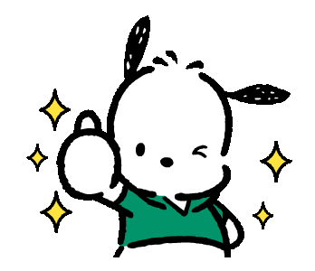 Pochacco, the cute cartoon dog, gives a cheerful thumbs up and wink, surrounded by sparkling stars.
