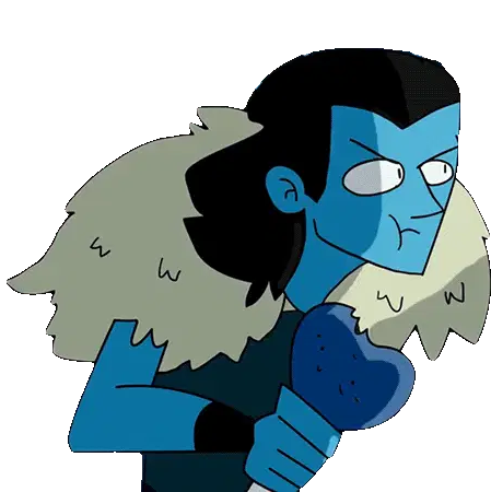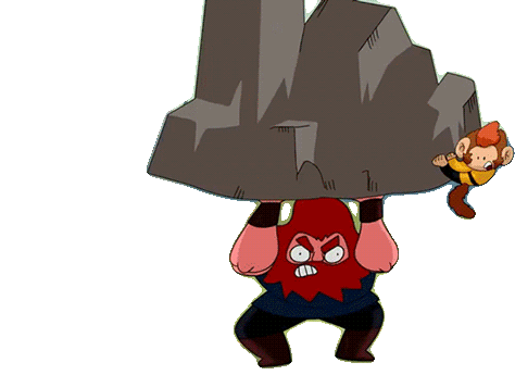 A powerful character from Destripando La Historia struggles to lift a massive rock, showcasing immense strength with a monkey on top.