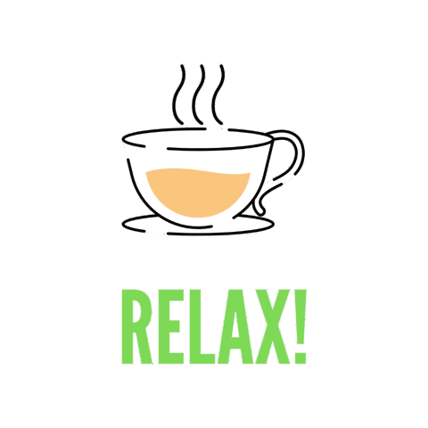 A simple line art illustration of a steaming cup of coffee with the word 'RELAX!' written below it, conveying a sense of calm.