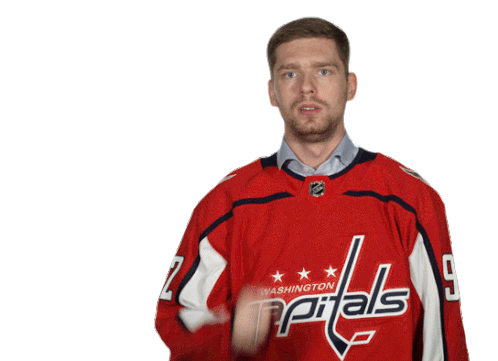Evgeny Kuznetsov, wearing his Washington Capitals jersey, points directly at the viewer with a determined expression.