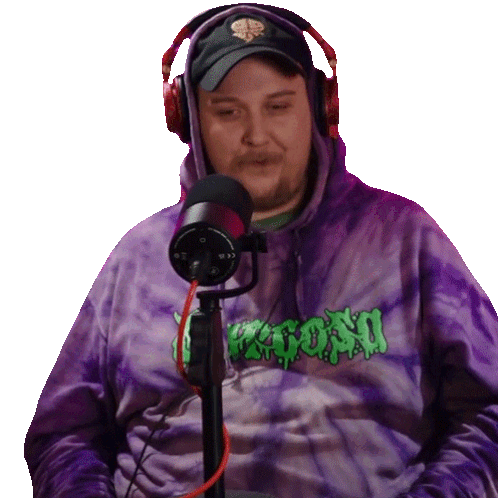 Austin Dickey, wearing a tie-dye hoodie and headphones, gestures with his finger while speaking into a microphone.