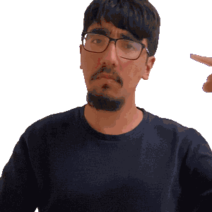 a man with glasses and a beard is pointing to his face