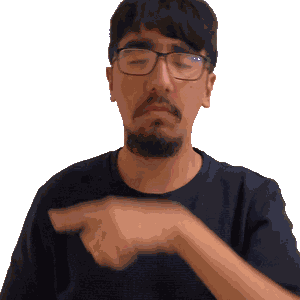 a man wearing glasses and a black shirt is pointing