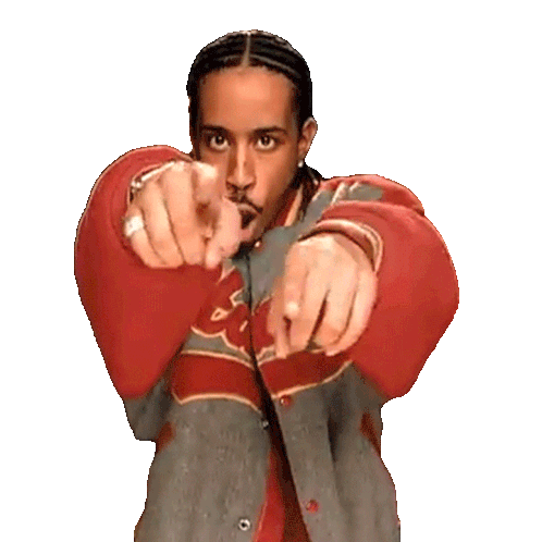 Ludacris, wearing a red and grey varsity jacket, points directly at the viewer with both hands, making a direct and engaging gesture.