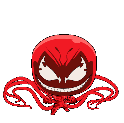 Chibi Carnage points downwards with sharp, menacing fingers, showing off its sharp teeth and angry expression.