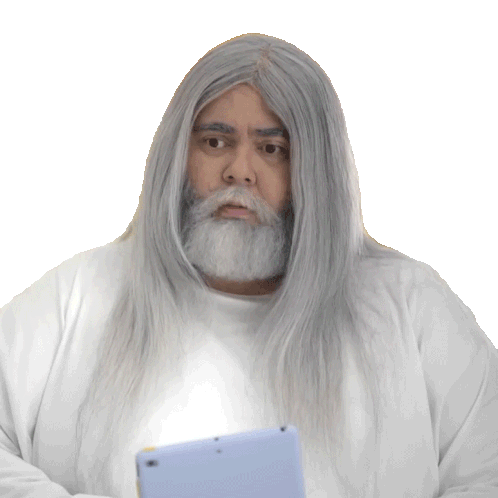Fábio De Luca as a 'God' character, looking surprised and holding a tablet, exclaiming 'Pois é'.