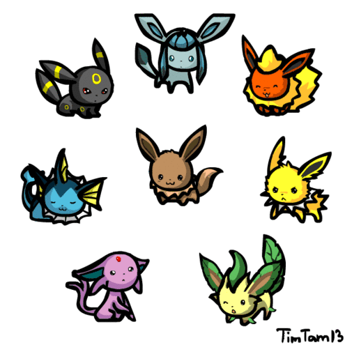 Adorable animated sticker featuring all Eeveelutions: Eevee, Umbreon, Glaceon, Flareon, Vaporeon, Espeon, Leafeon, and Jolteon in chibi style.