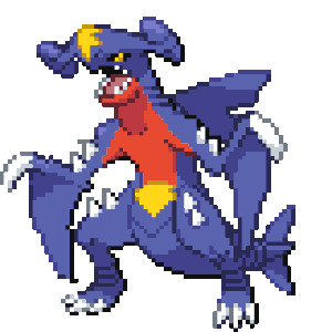 An animated pixel art sticker featuring Garchomp, the powerful blue and red Dragon/Ground-type Pokémon.