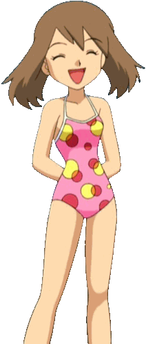 a cartoon girl wearing a pink and yellow polka dot swimsuit