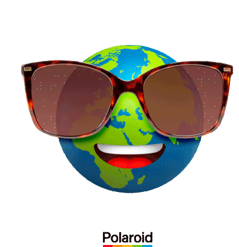 Animated globe wearing Polaroid sunglasses, promoting sustainability with the text 'Sustainability Is Good'.