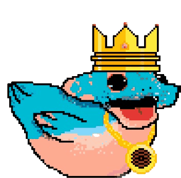 A cool pixel art bird from Polemos Fancy Birds, wearing a crown, sunglasses, and a gold chain. A unique animated sticker.